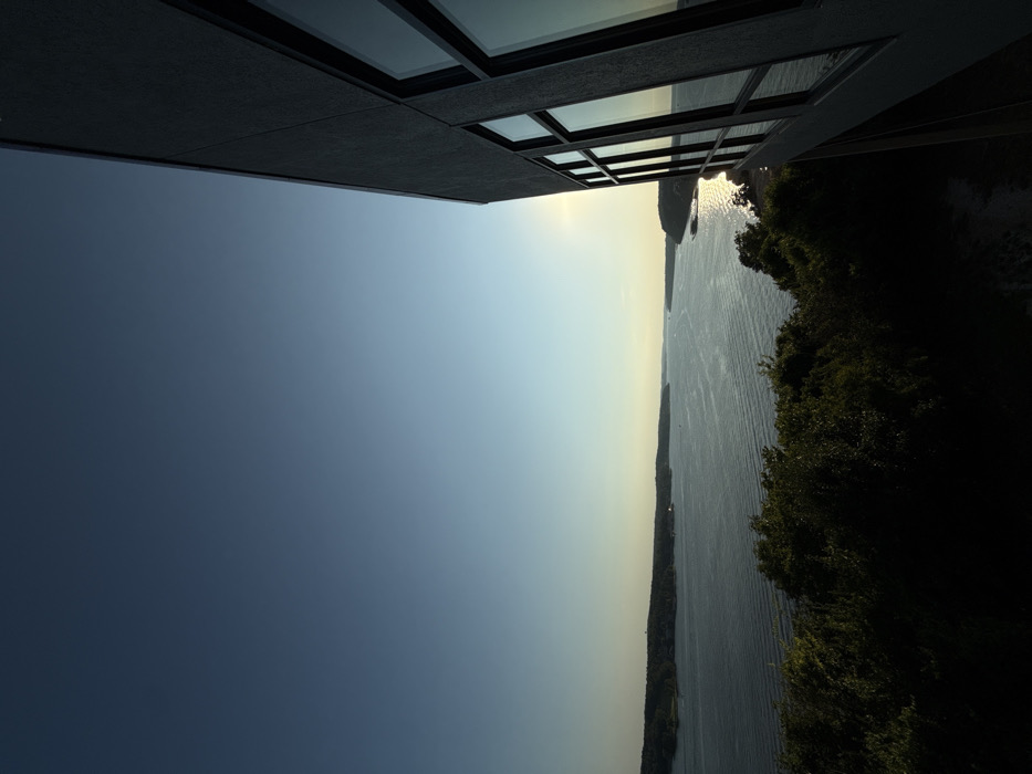 This image presents an elevated, wide-angle view overlooking Lake Ozark, United States, during late afternoon or early evening. The expansive Lake Ozark occupies the midground, its surface marked by distinct horizontal ripple patterns, prominently reflecting the low-lying sun positioned towards the right horizon. Distant landmasses, heavily covered in dark green foliage, delineate the lake's shores on both sides. The sky transitions from a deep blue overhead to a lighter, pale yellow hue near the horizon. In the right foreground, a portion of a dark, angular, modern building is visible, featuring a textured facade and multiple rectangular windows that reflect the bright sky and sun glare. Dark green tree canopies are visible immediately below the vantage point in the lower left portion of the frame. No individuals, animals, or discernible activities are present in the scene.