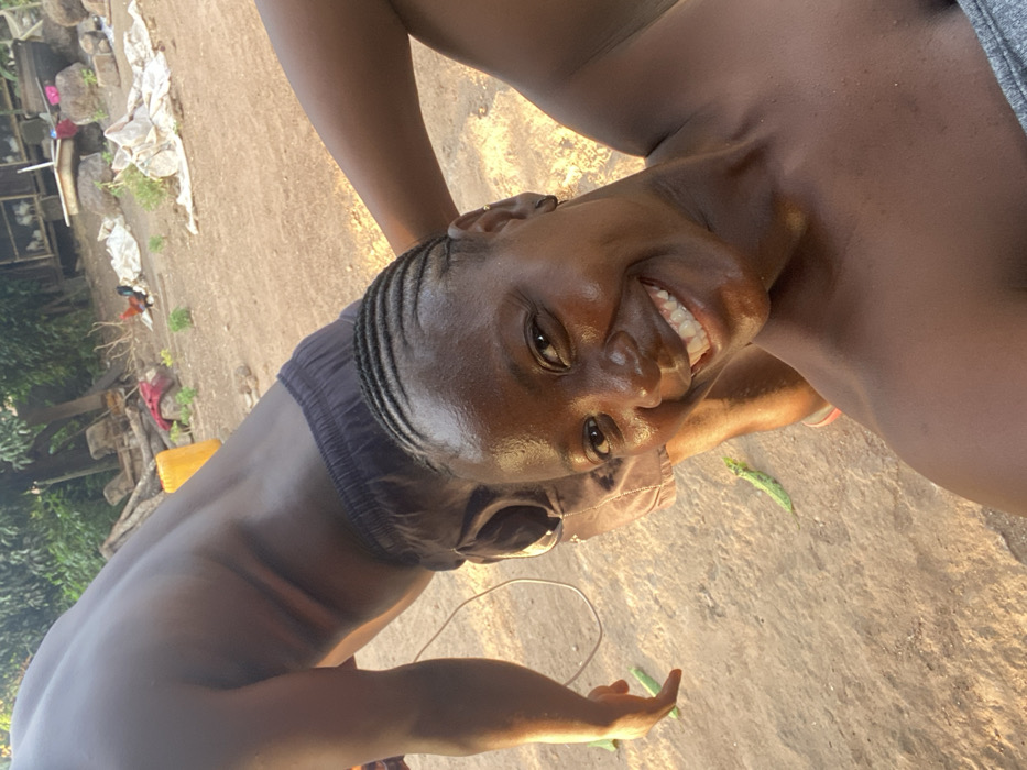 An outdoor scene in Akwanga, Nigeria, depicts two individuals within a residential or semi-rural compound. In the foreground, an adult female with dark skin and braided hair smiles directly at the camera, taking a selfie. She wears a grey strapless top. Her left arm is raised, consistent with holding a camera. In the mid-ground, partially obscured by the woman, an adult male with dark skin is seen from the back, leaning forward. He wears dark shorts, with his bare upper torso exposed. His left hand is positioned near several green, elongated pods on the light brown, dusty ground. A white cable or wire is also visible on the ground near his left leg. The background features a yellow plastic jerrycan, scattered rocks, and green foliage. Further back, a wooden structure with a corrugated metal roof, consistent with a chicken coop, is visible, containing several chickens. A rooster with red and black plumage stands on the ground to the right of the yellow jerrycan. White cloths or tarps are also present on the ground in the background.