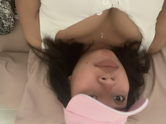 A person lies on a pink pillow, wearing a white top with buttons and a gold necklace. They also sport a pink baseball cap. The individual's head is slightly tilted, with dark hair spread around them. Their expression is serene, and they gaze directly at the camera. The lighting is soft and natural, creating a relaxed and intimate atmosphere. A piece of patterned fabric is visible in the upper left corner of the image.