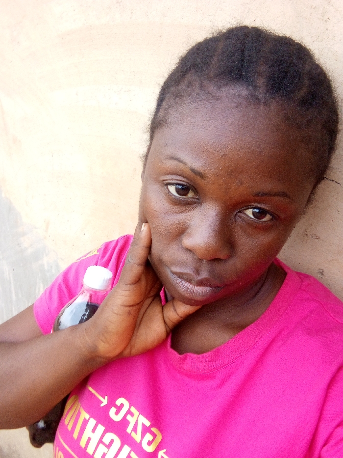 A female, appearing to be in Agban, Nigeria, is depicted in a close-up selfie-style shot against a plain, light beige-colored wall