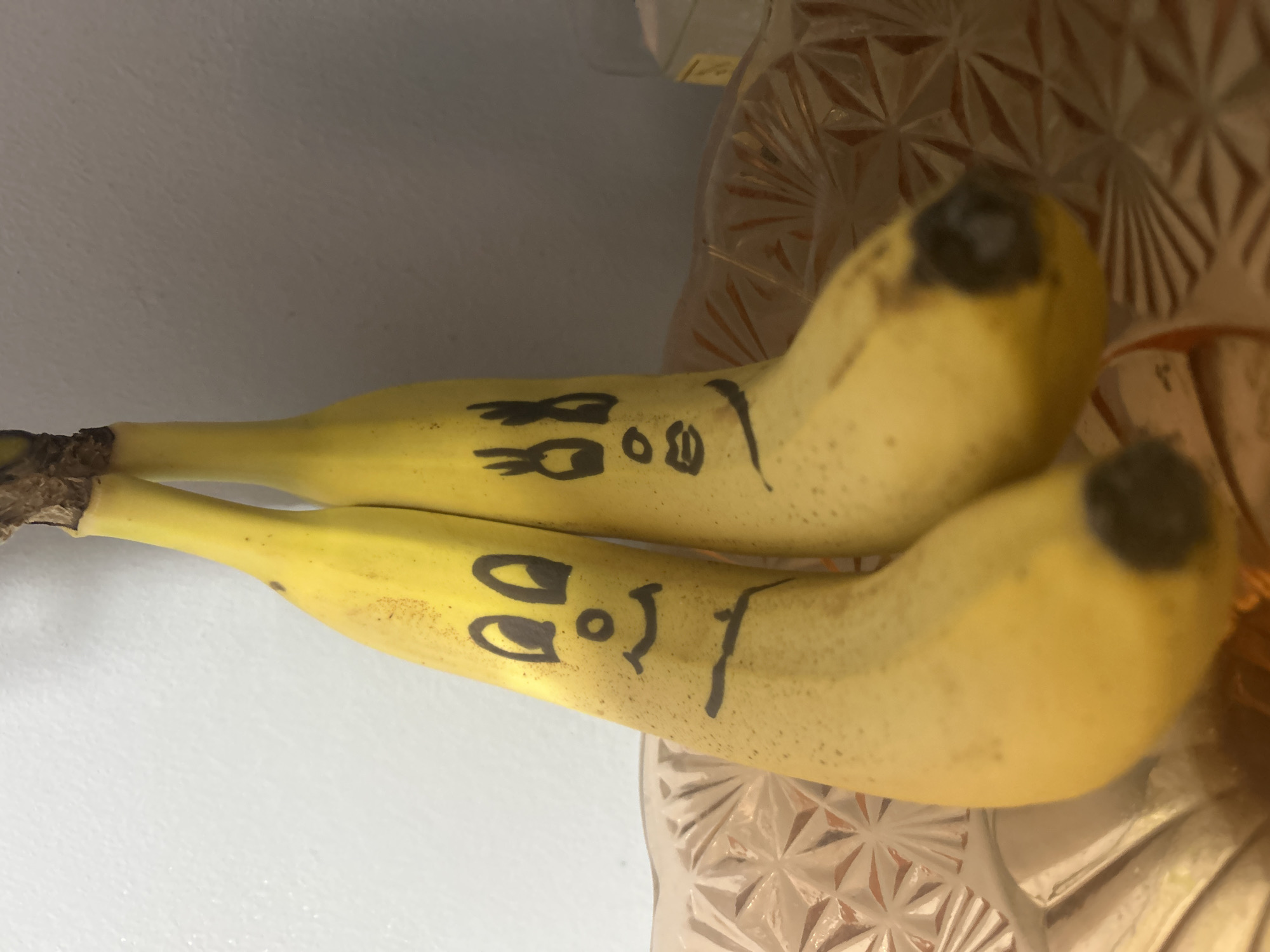 Two yellow bananas with black marker drawings of faces are positioned on top of a clear, patterned glass surface