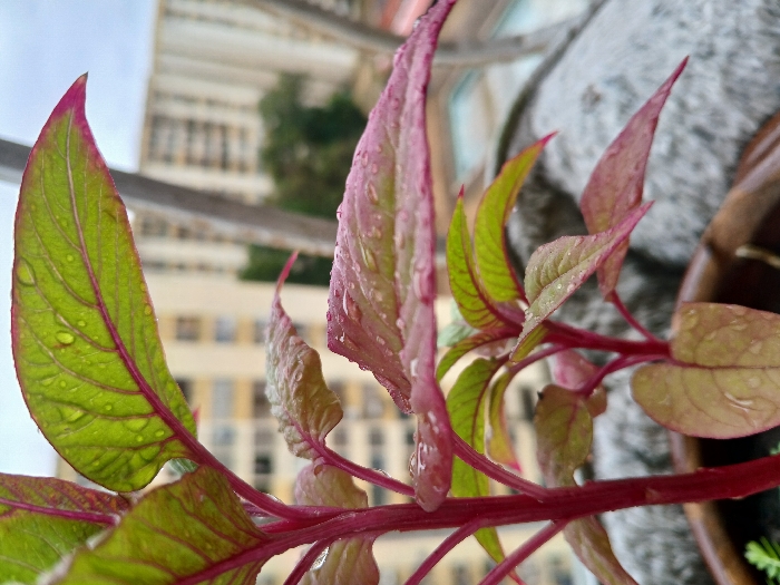 The image presents a close-up, upward-angled view of a potted plant on what appears to be a high-rise balcony in Ciudad Guayana, Venezuela. The plant features vibrant red stems and leaves that transition from green centers to reddish-purple edges and veins. Numerous small, clear water droplets are visible on the leaf surfaces, indicating recent precipitation. The plant is contained within a dark brown pot, partially visible in the lower right. In the blurred background, multiple light-colored, multi-story residential buildings with rectangular windows are discernible against an overcast sky, interspersed with the indistinct form of a green tree. No individuals are present in the scene.