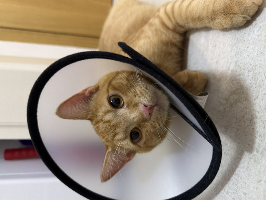 - "A ginger cat wearing a black-trimmed cone of shame looks inquisitively at the camera" by FM-GuW672, licensed under CC BY 4.0