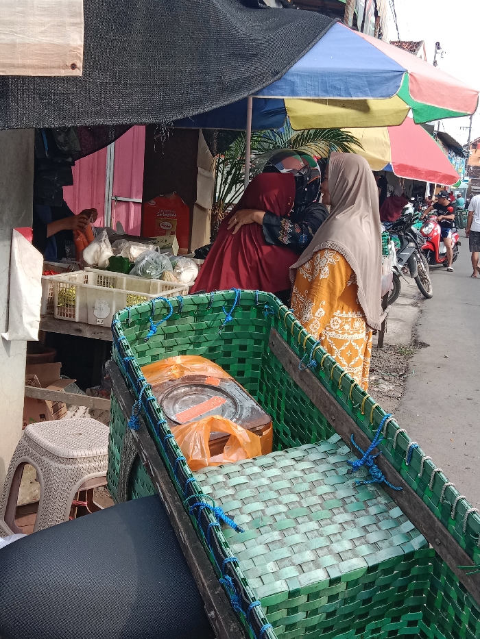 A green, woven basket is in the foreground, secured with blue rope, attached to a black motorcycle seat. A metal object wrapped in orange plastic is in the basket. In the background, two women in headscarves embrace near a vendor’s stall. The stall has produce in crates, and a person sits behind the display. Colorful umbrellas shade the stall. Motorcycles and a pedestrian are visible on the right side of the frame.