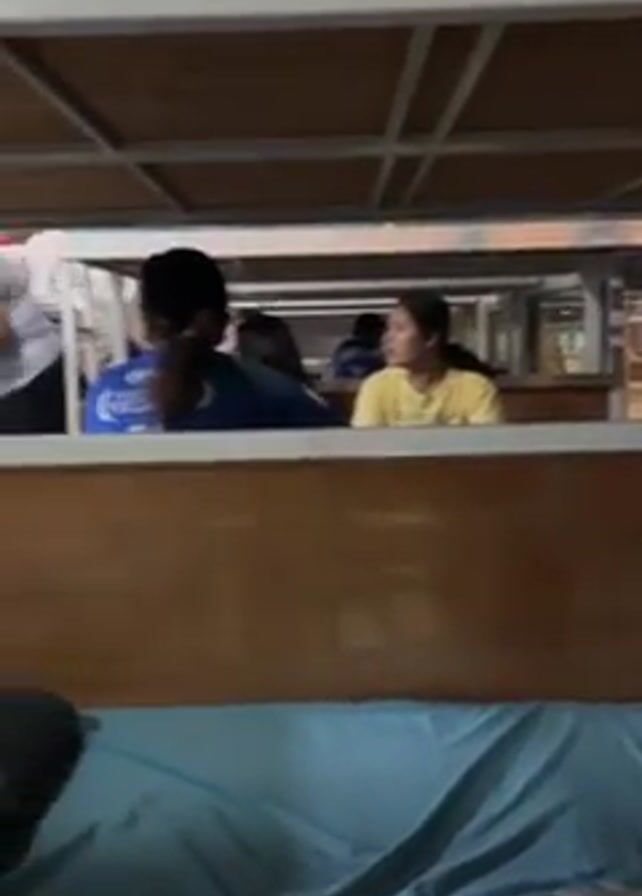 interior of a dormitory room filled with bunk beds. Several people are sitting on the top bunks, talking and interacting. Some individuals are walking around the room, appearing to be organizing their belongings or moving around. The bunk beds are simple, made of metal and wood, with blue bedding on the mattresses. The room is lit by overhead fluorescent lights. There is some background noise, consisting of conversations and general activity sounds.