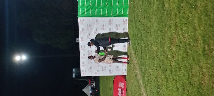 The image depicts an outdoor awards ceremony at night on a grassy sports field, identified as a rugby venue in Nairobi, Kenya, likely the RFUEA Grounds