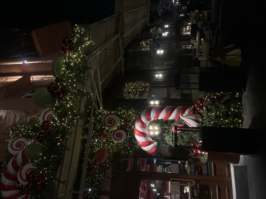 Christmas decorations adorn an outdoor space. A decorated tree featuring lights, candy canes, lollipops, and macaroons is prominent. A red and white candy cane archway adds to the festive scene. Wreaths are placed on the building in the background. The area is dimly lit, suggesting a nighttime setting. The location appears to be a restaurant or cafe with outdoor seating.