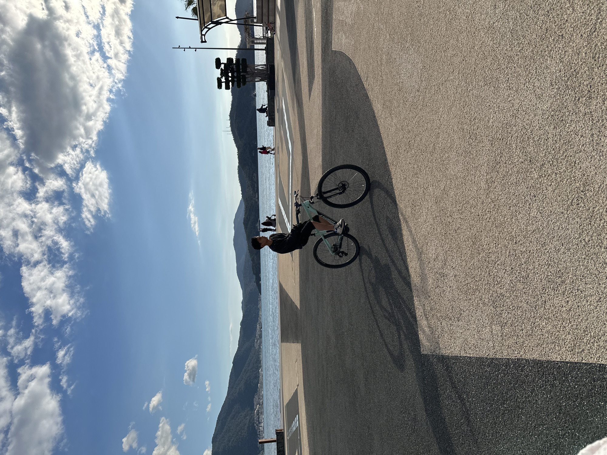 man standing on a concrete promenade next to the sea. He is holding a light blue mountain bike. His shadow is cast onto the promenade. In the background are mountains, the sea, and a clear blue sky with white clouds. The promenade extends further with people walking in the distance. Some lighting structures are visible. The location is likely Fethiye, Turkey, based on the typical coastal scenery and architecture found in that region.