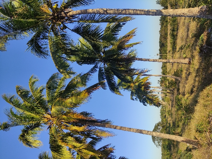 A scenic landscape featuring tall coconut palm trees lining a field under a clear blue sky. The trees' green fronds sway in the breeze. The field displays a mix of vegetation, suggesting a tropical or subtropical environment. The trunks of the palms are thick and textured. The image captures the tranquility of a tropical scene with a blend of natural elements.