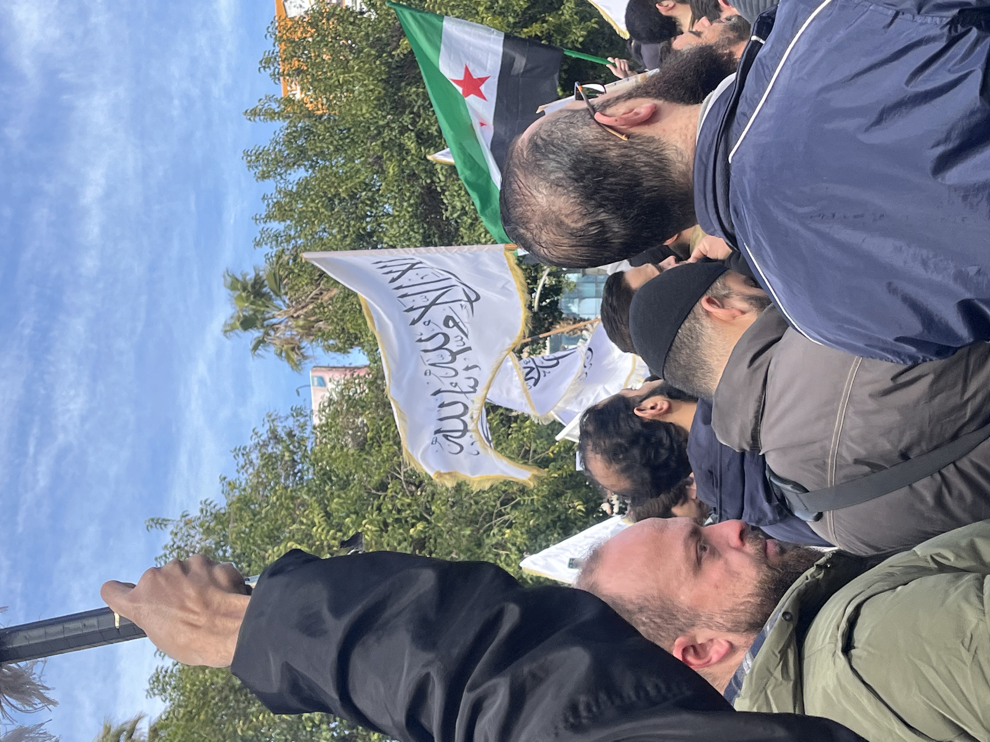 The scene depicts a daylight outdoor gathering of individuals, predominantly men, located within the As-Salihiya Municipality, Syria. A crowded formation occupies the frame, with approximately 15-20 persons identifiable. In the foreground left, a man with a trimmed beard and dark hair, wearing a green puffer jacket, looks forward and slightly downwards. To his right, the back of a man's head with a receding hairline, dark beard, and glasses is visible; he wears a dark blue track jacket with white piping. In the upper left, a light-skinned hand, covered by a black sleeve, grips and elevates a dark pole or flagstaff. Multiple white flags with black Arabic calligraphy (the Shahada) and gold fringing are prominently displayed throughout the crowd, held aloft by unseen individuals. One Syrian opposition flag, characterized by horizontal green, white, and black stripes with three red stars, is also visible on the right side of the frame. The background consists of green foliage, including deciduous trees and a palm tree, partially obscuring distant buildings with light-colored and orange facades. The sky above is blue with scattered thin white clouds. No direct interactions between individuals are discernible, but their collective orientation and the display of flags suggest participation in a unified event.