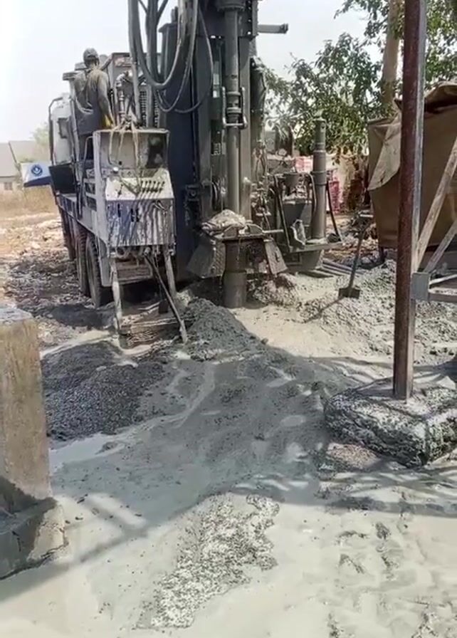 drilling rig in operation, with a person visible on the platform of the truck-mounted machine. The ground surrounding the rig is covered in a slurry of mud and rock fragments, indicating active drilling. There is a concrete structure and a makeshift shelter in the background, along with trees and a clear sky suggesting an outdoor work environment. The rig's mechanical components are in motion, and the sound of the drilling operation is audible.