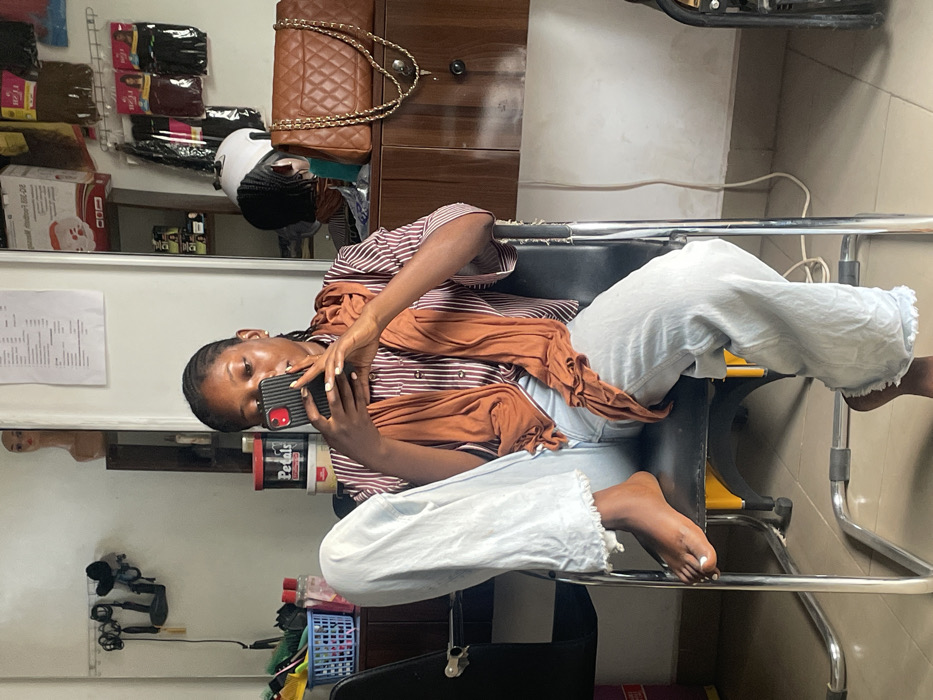- "A woman sits in a black salon chair, holding her phone to take a picture" by FM-qoGlk2, licensed under CC BY 4.0