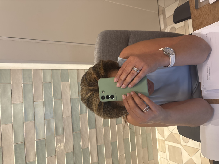 An adult individual is seated at a wooden desk, partially obscuring their face with a sage green smartphone. The phone, held horizontally, displays a triple-lens camera array and a flash on its rear. The individual has brown hair with lighter streaks and wears a light-colored sleeveless top. A ring with multiple small stones is on the left ring finger, and a wider band ring is on the right ring finger. A white wristwatch with a circular, silver-toned face is visible on the right wrist. Stacks of white papers, some containing Hebrew text, are on the desk in front of the person. The background features a wall composed of horizontal rectangular tiles in alternating light blue-green and pale beige hues, laid in a staggered pattern. To the right, a plain light-colored wall or door is visible beyond a white vertical frame. The person is seated in a grey upholstered chair. A geometric patterned floor in varying shades of beige and light brown is visible in the lower left and under the desk. The scene is located in the city of Bnei Brak, Israel.