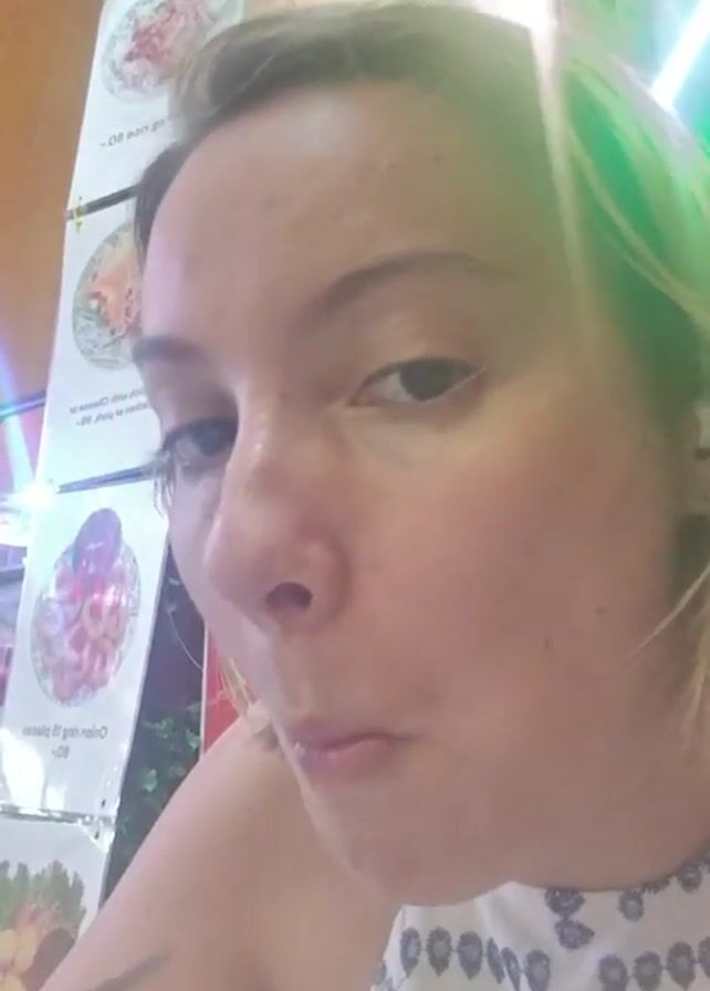 A woman with fair skin and short brown hair is the focal point of the video, positioned in close-up. She is wearing a white sleeveless top with blue and gray embroidery. Her expression shifts from a contemplative gaze to a surprised, wide-eyed look. She seems to be eating something, indicated by her slightly pursed lips and the movement of her mouth. A pair of white wireless earbuds are visible in her ears. Behind her is a wall adorned with menu boards, displaying images and prices of various dishes. The environment appears to be a casual dining setting, possibly a restaurant. The lighting is somewhat harsh, casting a green tint and causing a glare in certain areas.