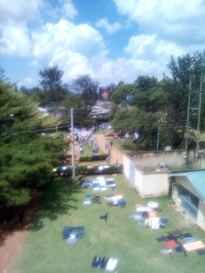 The image displays an outdoor scene in Bondo, Kenya, observed from an elevated vantage point under a sky with scattered white cumulus clouds. In the foreground, a green lawn features numerous articles of clothing and textiles laid out flat for sun-drying, including items in black, blue, white, and red. A dark, unidentifiable object rests on the grass near the center. To the right, parts of two buildings are visible: one light-colored, single-story structure with a flat roof, and another adjacent building with a teal-colored sloped roof and barred windows. The midground is traversed by an unpaved pathway or road, populated by multiple individuals walking in various directions. Along this pathway, bordered by green bushes, additional laundry items are visible, some appearing to be hung. A utility pole with overhead wires is centrally located, surrounded by dense green trees and vegetation. The background is characterized by a heavily treed landscape, with a larger gathering of people discernible further down the pathway. A large, colorful billboard or sign is partially visible through the trees in the distant background. The scene is illuminated by bright daylight.