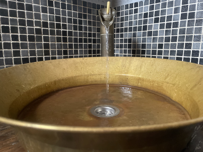 - "The image displays a close-up, eye-level view of a circular, golden-toned metal vessel sink with water actively flowing into it from a vertical, minimalist faucet" by FM-YBch83, licensed under CC BY 4.0
