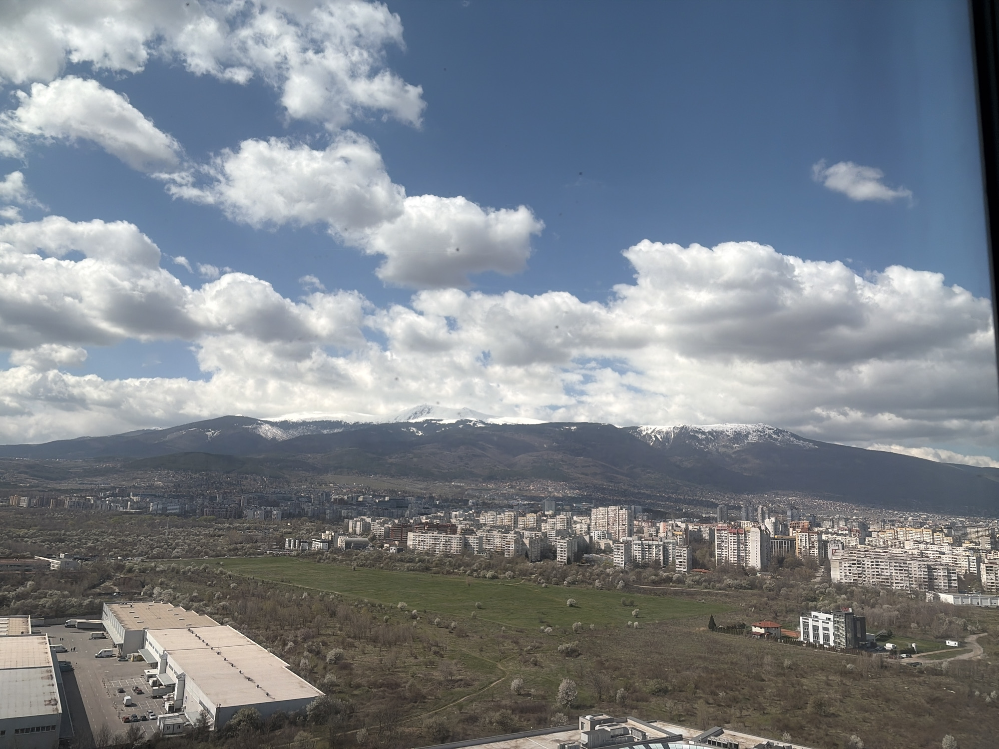 The image presents a broad view of Sofia, Bulgaria, with a mountainous backdrop featuring snow-capped peaks. The foreground features a mix of industrial and urban development, including warehouses and clusters of residential buildings. A green field spans between these areas. The sky is predominantly blue with scattered white clouds. The image is taken from an elevated position, possibly inside a building looking out.