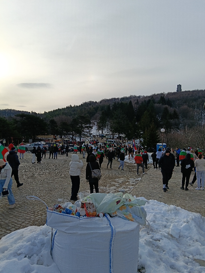 The scene depicts a large outdoor gathering on Shipka Peak, near the city of Shipka, Bulgaria, during a winter day under an overcast sky. In the immediate foreground, centered, a large white woven polypropylene bulk bag, approximately 1.5 meters tall, filled with miscellaneous refuse including plastic bottles, wrappers, and bags, rests on a pile of snow. A lighter-colored plastic bag partially covers the trash. The midground features a wide, light-colored paved area, likely cobblestone, partially covered with snow and slush. Numerous individuals, estimated between 70 and 100, are dispersed across this paved area, walking and standing. They are predominantly dressed in winter attire, including dark-colored jackets, coats, and hats. Several individuals are visibly displaying Bulgarian national flags (white, green, and red horizontal stripes), either draped over shoulders or held aloft. Vehicles are partially visible parked further back on the left side of the paved area. A blue portable toilet is discernible on the right side, behind the crowd. The background consists of a densely forested hillside, showing a mix of bare deciduous trees and dark green conifers. On the highest point of the distant ridge, in the upper right quadrant, stands the prominent, dark stone Shipka Monument, a rectangular tower with a visible arched entrance. The sky above is a uniform light grey, with a hint of brightness on the far left horizon. Patches of snow are visible on the ground throughout the scene, indicating cold weather conditions.