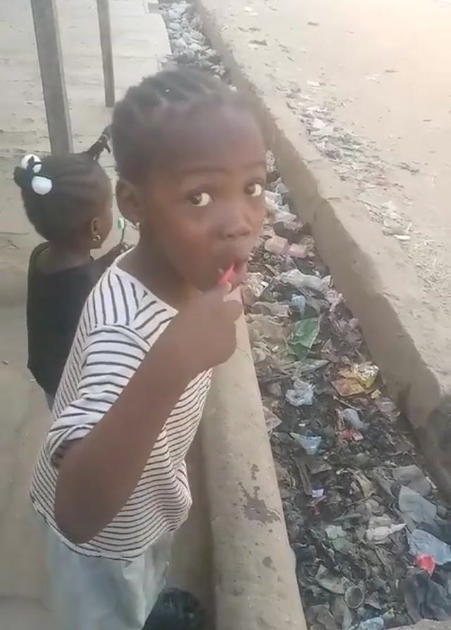 A young girl with braided hair and wearing a white-and-black striped shirt and light blue shorts is brushing her teeth with a red toothbrush. She's standing on a concrete ledge next to a trash-filled drainage ditch. A younger girl with braided pigtails and a white bow stands behind her. In the background, people walk along a dirt road in an area with simple structures and some trees. The overall scene suggests a low-income or developing area.