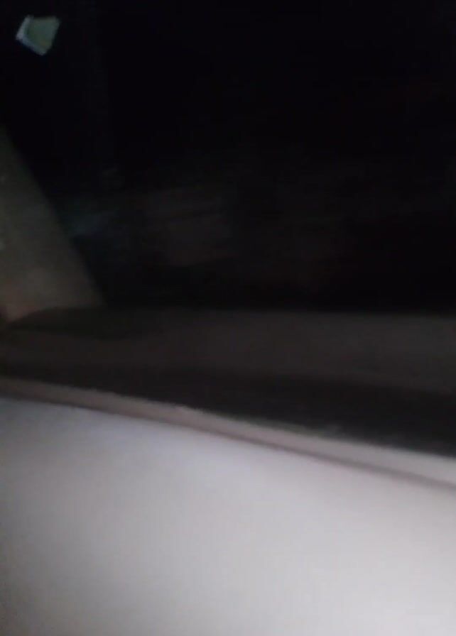 interior of a car at night, specifically focusing on the car door and window. The lighting is low, making the outside environment dark. Occasional lights appear as the car moves, likely from streetlights or other vehicles. The door panel is light gray or beige. Music is audible.