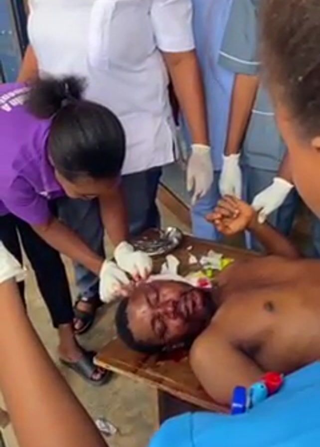 A group of health care workers are gathered around a man lying shirtless on a wooden surface. The man has blood on his face, particularly around his nose and mouth. The health care workers are wearing gloves and medical scrubs or white coats. One worker in a purple shirt uses a medical tool, possibly tweezers, to clean the man's face. There are medical instruments, cotton swabs, and blood on the wooden surface. The scene appears to be taking place outdoors.