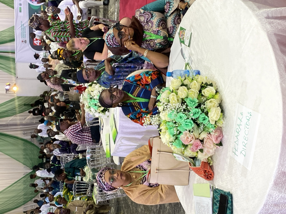An indoor conference is depicted in Unguwar Sarki, Nigeria, featuring approximately 60-70 attendees primarily seated at numerous round and rectangular tables