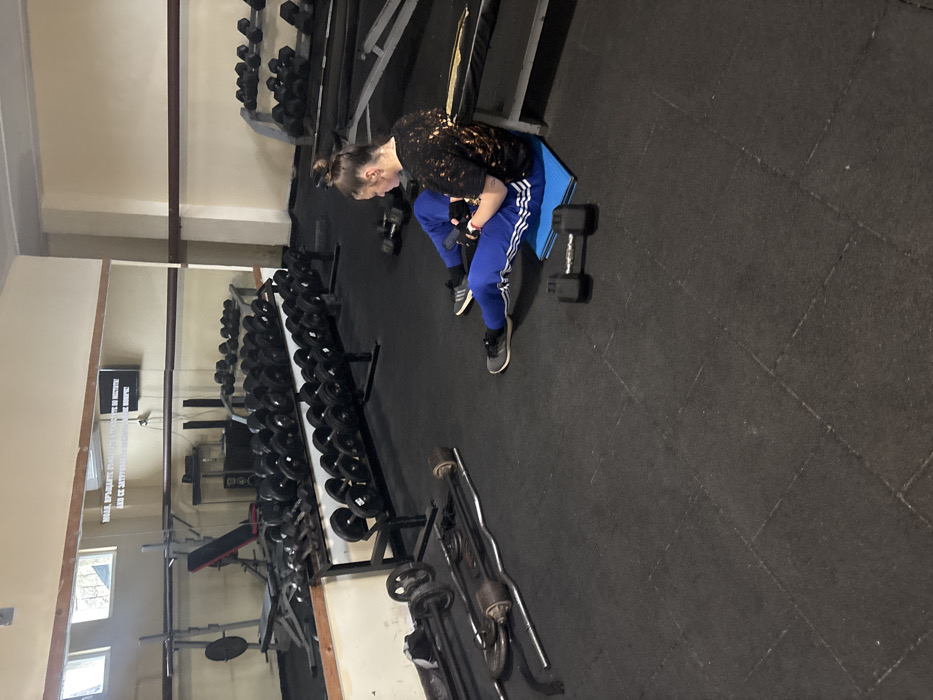 The image depicts the interior of a fitness gym located in Veliko Tarnovo, Bulgaria. The floor is covered with black rubber tiles, and the walls are a light beige color with a dark horizontal trim line. In the mid-ground, slightly to the right, a female individual is seated on a blue rectangular exercise mat. She wears a dark, possibly tie-dye or splatter-patterned, long-sleeved shirt, blue athletic pants with three white stripes down the sides, and dark athletic shoes with white soles. Her hair, light brown or auburn, is tied up in a bun. Her head is bowed, and her attention is directed downwards towards her hands, which appear to be engaged with an object or adjusting wrist straps. Two black hexagonal dumbbells rest on the floor directly in front of her. To the left of the seated individual, various barbells, including straight and EZ curl bars, and several dark weight plates are lying on the black rubber floor. Along the left wall, a large, rectangular mirror reflects parts of the gym, including an exterior window, an adjustable weight bench, and a section of a dumbbell rack. Visible in the mirror's reflection is Bulgarian text, indicating gym rules: "МОЛЯ, ВРЪЩАЙТЕ ТЕЖЕСТИТЕ НА МЕСТАТА ИМ И СЕ ОТНАСЯЙТЕ С ВНИМАНИЕ!", which translates to "PLEASE, RETURN THE WEIGHTS TO THEIR PLACES AND TREAT WITH CARE!". A prominent black metal rack, stocked with multiple pairs of black dumbbells of various weights, extends across the middle ground. Further back and to the right, another dumbbell rack is partially visible, also holding black dumbbells. A simple black weight bench is positioned behind the seated individual. The overall environment suggests a functional, well-equipped gym.