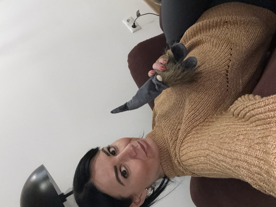An indoor scene in the city of Lohberg, Germany, depicts a single female subject in a reclined position, looking directly at the viewer. The female has dark hair, dark eyes, and is wearing a textured, metallic gold or bronze knit turtleneck sweater over dark trousers. Her right hand, with red nail polish, holds a small plush gnome figure. The gnome has a conical grey hat, a shaggy brown beard, and grey feet. The subject is situated on dark, upholstered furniture, likely a couch or chair. The background features a plain white wall. In the upper left quadrant, a portion of a black domed lamp shade is visible. In the upper right quadrant, a white electrical outlet with a black power cord plugged into it is present. The scene is illuminated by artificial lighting.