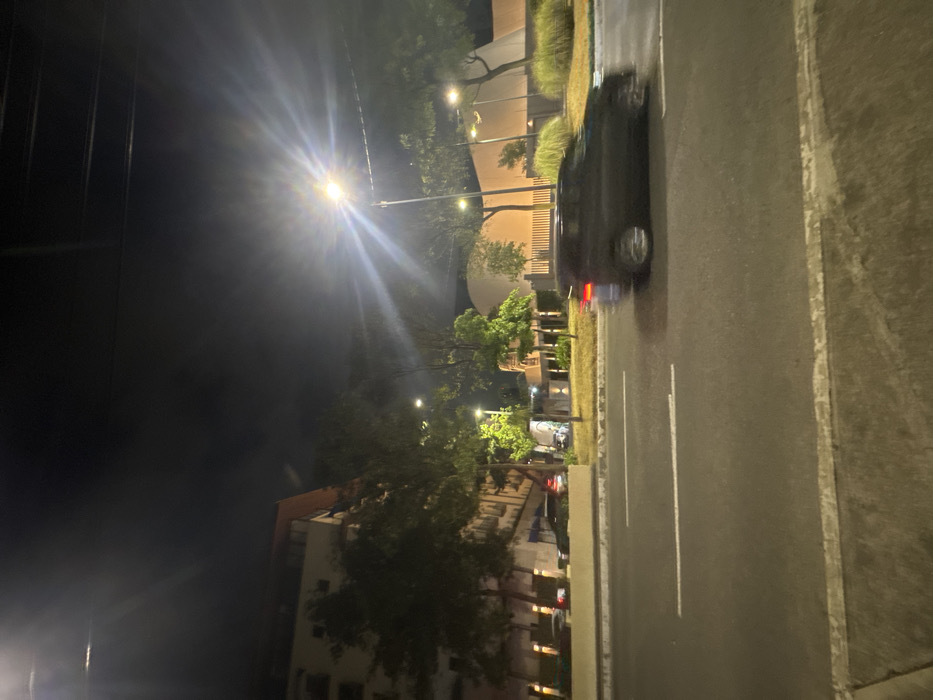 The image depicts an urban street scene at night in Mexico City, Mexico, specifically in the Polanco neighborhood. The view is from a street-level perspective, looking down a multi-lane asphalt road. In the foreground, the paved road features two visible solid white lines, indicating lanes. A low concrete median separates the roadway from a sidewalk and green space on the left. Midground elements include a dark-colored SUV in motion on the road, blurred to convey movement, with its rear lights faintly visible. Several streetlights illuminate the scene, casting strong starburst flares, with one prominent streetlight pole positioned to the right of the image center. Trees with green foliage are visible along the median and in the background, some brightly lit. In the background, on the left, a multi-story building with a light-colored facade and a distinctive reddish-brown sloped roof is partially visible. Further to the right, behind trees, prominent architectural structures are discernible. A large, light-colored building with a distinct curved, shell-like or dome-like roof structure is visible, consistent with Teatro Telcel. To its left, a multi-faceted, irregular-shaped building with a brownish hue, obscured by trees, resembles a portion of the Museo Soumaya. Both structures are part of the Plaza Carso complex in Polanco. Other parked vehicles are visible in the distance on the left side, behind trees. The sky is dark, indicating nighttime.