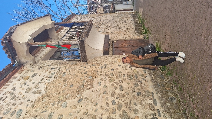 In the city of Dupnitsa, Bulgaria, a single adult female walks on a reddish-brown brick-paved surface next to a two-story stone building. The building features an aged, irregularly coursed stone facade with visible mortar and areas of plaster degradation. A traditional red-tiled roof crowns the structure, with a decorative brick pattern visible below the roofline. On the second story, a small balcony with a black wrought-iron railing and a white, curved support structure extends from the facade. Two flags are draped over the balcony railing: one displaying red and green colors, and another blue. Directly beneath the balcony, on the ground level, a weathered wooden door is set into the stone wall. The female subject, with reddish-brown hair, is dressed in a dark green top, a brown faux-fur vest, a black puffy jacket, black pants with white side stripes, and white athletic shoes. She carries a black textured shoulder bag. Green vegetation grows in cracks along the base of the wall. Above the building, a clear blue sky is visible, along with the bare branches of a deciduous tree.
