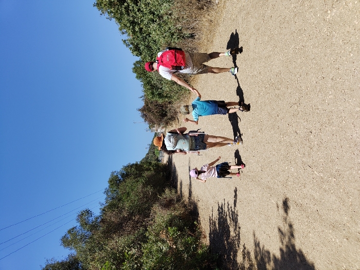 The image captures four individuals walking away from the camera on a wide, unpaved dirt path under a clear blue sky in the Maale Yosef Regional Council, Israel. The path, light brown with visible gravel, is flanked on both sides by dense green and brown shrubbery and trees. From left to right, the subjects are a young girl, an adult female, a young boy, and an adult male. The young girl, positioned on the far left, wears a light pink cap, a light-colored t-shirt, and a dark patterned skirt. The adult female, located to the right of the girl, wears a light-colored top, dark shorts, and a light brown wide-brimmed hat. She carries an infant or small child in a front-facing carrier on her chest and also has a light-colored backpack. The young boy, to the right of the adult female, wears a blue ombre t-shirt and dark shorts. He holds the right hand of the adult male. The adult male, on the far right, wears a white t-shirt, light shorts, a red baseball cap, and a red backpack. Shadows are cast from the left onto the foreground of the dirt path. In the upper left background, multiple power lines are visible traversing the clear blue sky. A faint, light-colored structure is partially discernible through the distant vegetation on the horizon. The scene is illuminated by direct sunlight.