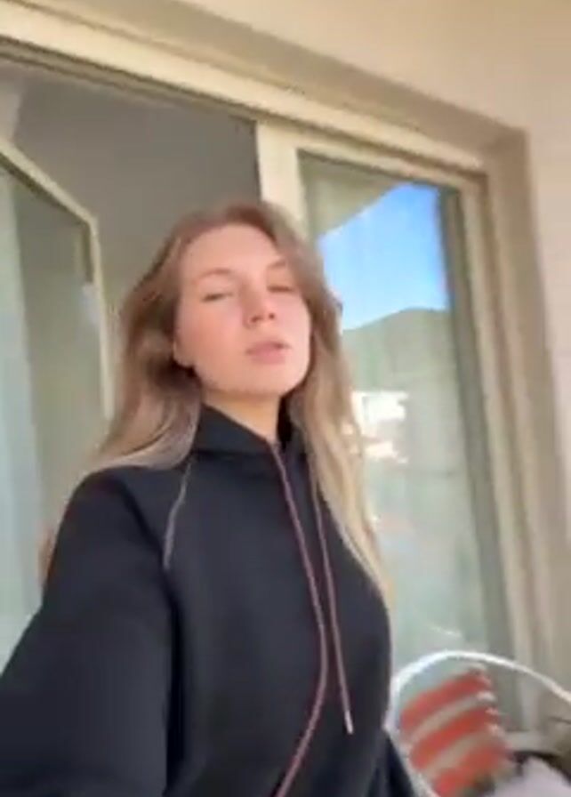 young woman standing on a balcony, taking a selfie video