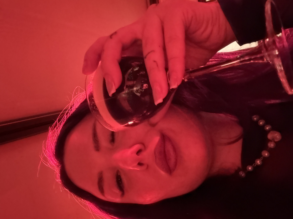 A low-angle close-up captures a woman in an indoor setting in Venice, Italy, under pervasive red lighting. Her long, dark hair frames her face. Her left eye is open and heavily lined; her right eye is closed or winking. Her full lips are slightly pursed. She wears a dark garment and a necklace of irregularly shaped, light-colored pearls. Her right hand, nails featuring light polish, holds a stemmed glass containing a dark, foamy liquid. Faint linear markings are discernible on the back of her right hand. The background is uniformly red and indistinct, with dark linear structural elements visible in the upper frame.
