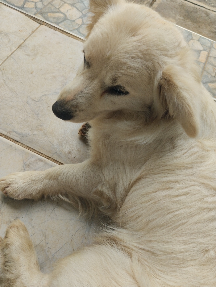 - "The scene, located in Mahiakalo ward, Kenya, depicts a light-cream-furred dog resting on a tiled floor" by FM-ceYJN2, licensed under CC BY 4.0