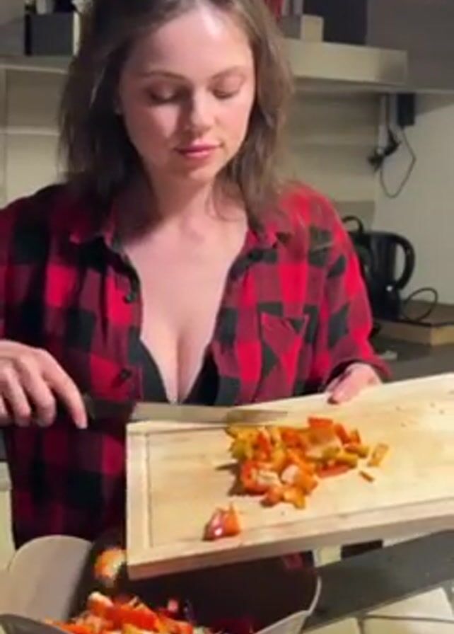A woman is preparing food in a kitchen. She is wearing a red and black plaid flannel shirt over a black top. She is holding a wooden cutting board filled with diced orange and red vegetables. She uses a knife to push the vegetables off the cutting board into a brown bowl that already contains other chopped ingredients. A kettle is visible on the counter behind her, along with other kitchenware on a shelf.