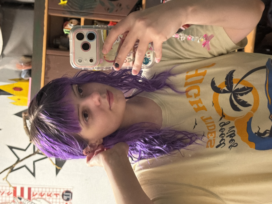 - "A person with purple hair takes a selfie holding a phone with a clear case decorated with stickers" by FM-3WDDJ2, licensed under CC BY 4.0
