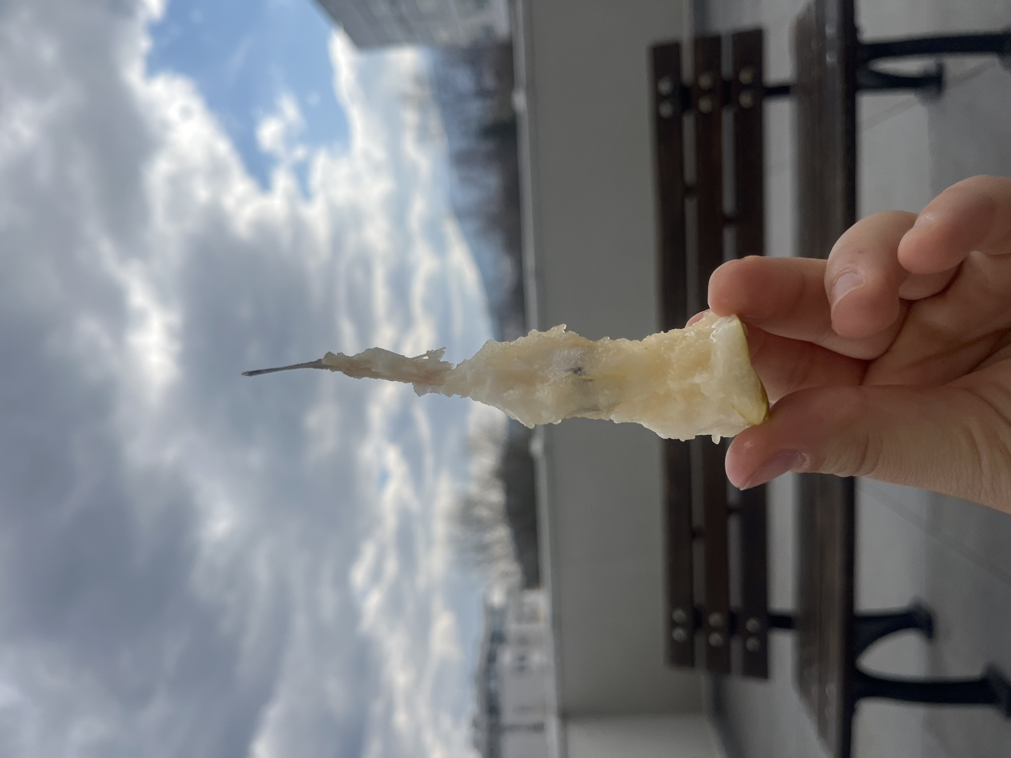 A human hand, light-skinned, holds a partially consumed piece of light-colored fruit, likely an apple or pear core, between the thumb and forefinger