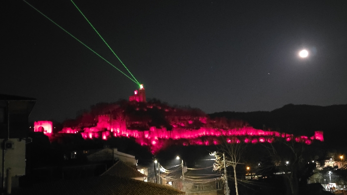 - "A nocturnal long-shot photograph captures the Tsarevets Fortress in Veliko Tarnovo, Bulgaria, illuminated in vibrant magenta light on a prominent hill under a clear, dark sky" by FM-BFixr1, licensed under CC BY 4.0