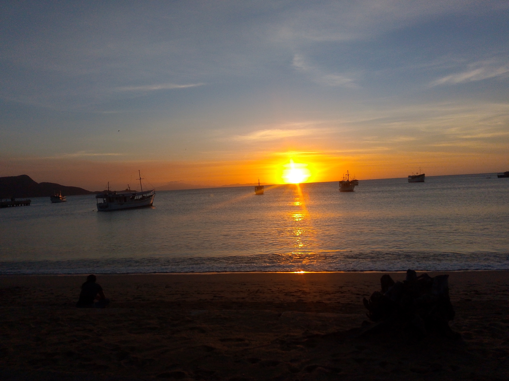 The image depicts a sunset scene over a body of water in Juan Griego, Venezuela, viewed from a sandy beach