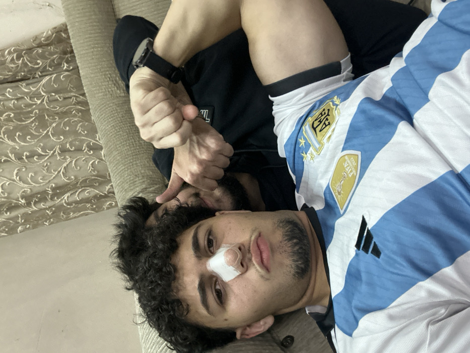 Two men recline on a textured sofa, one wearing an Argentina soccer jersey. The man in the foreground has curly hair and a bandage on his nose. Behind him, a darker-skinned man with a beard extends a hand with thumb down and wears a black watch and clothing. The background reveals a patterned sofa.