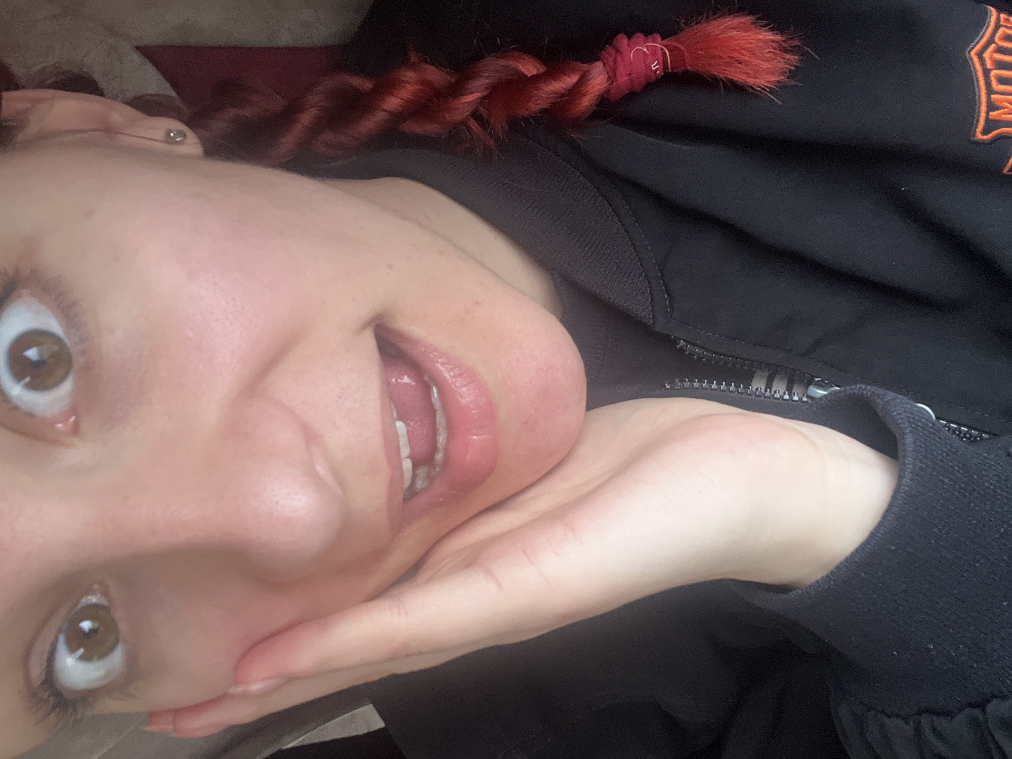 A person is holding their head in their hand, with red hair in a braid secured with a red band. The person is wearing a black jacket with a zipper. The jacket has an orange Harley-Davidson logo. The location is not discernible from the image.