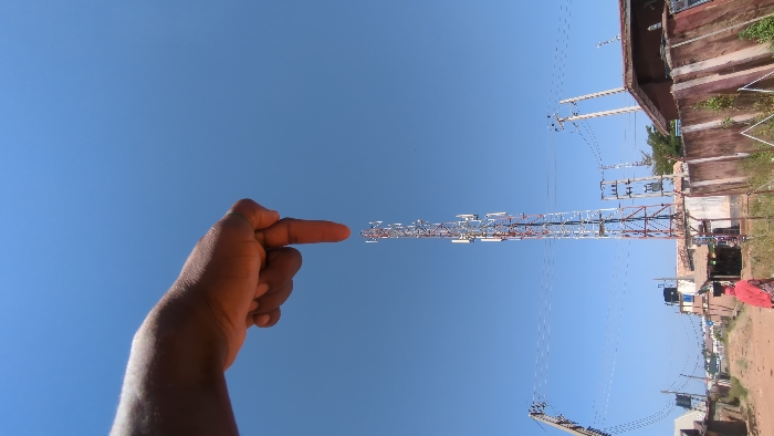 The image captures a daylight scene in Narayi, Nigeria, under a clear blue sky. In the foreground, a dark-skinned human right hand, with fingers curled and index finger extended, points downwards from the top of the frame. This finger is aligned directly above the summit of a tall, lattice-structured communication tower, creating a forced perspective. The communication tower, appearing silver and reddish-brown, is equipped with multiple antennae and associated equipment mounted along its height, standing vertically in the mid-ground. To the left of the tower, a dirt road or path extends into the distance, lined with various single-story buildings featuring mixed roofing materials. A person, dressed in a red head covering and red clothing, walks away from the camera along this path, appearing to carry an item on their head. On the far left, a wooden utility pole with multiple power lines is visible. To the right of the tower, another utility pole supporting a transformer is present. The right side of the scene is bordered by a reddish-brown concrete wall, with sparse green vegetation along its base, partially obscuring additional structures behind it.