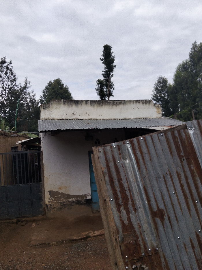 The scene depicts an exterior view of a residential or commercial compound in Nyansiongo ward, Kenya, under an overcast sky. In the center, a single-story building with white or light-colored plastered walls and a flat roof with a low parapet wall is visible. An additional structure with a corrugated metal roof extends from the main building, covering an entrance area. The lower portion of the building's walls shows significant dirt or mud splashing and weathering, exposing darker material underneath. A partially obscured blue door is visible within this covered section. To the left, a dark grey metal gate, composed of vertical and horizontal bars, provides access to the property. The foreground features unpaved, reddish-brown dirt ground with some scattered lighter aggregates. Prominently in the right foreground, a large, weathered, and rusted corrugated metal sheet stands vertically, angled towards the viewer, secured by visible rivets or nails. In the background and surrounding the structures are numerous tall, slender dark green trees; one particularly tall tree stands directly behind the main building's flat roofline. No individuals are present.