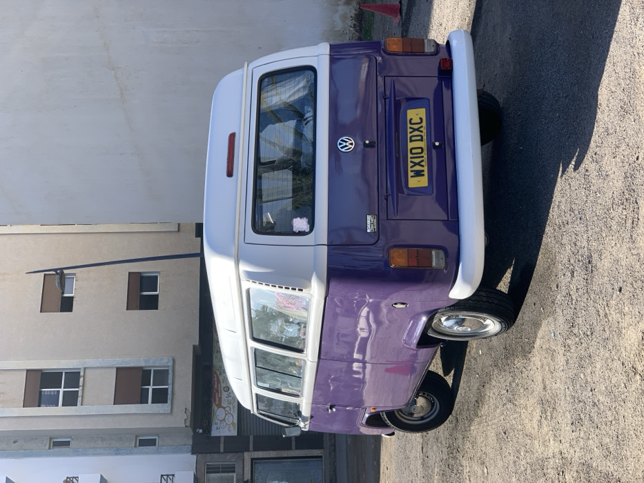 - "A two-tone Volkswagen Type 2 camper van, purple on its lower body and white on its upper section and high-top roof, is parked on a sunlit, unpaved gravel surface in M'diq, Morocco" by FM-Gn7EC2, licensed under CC BY 4.0
