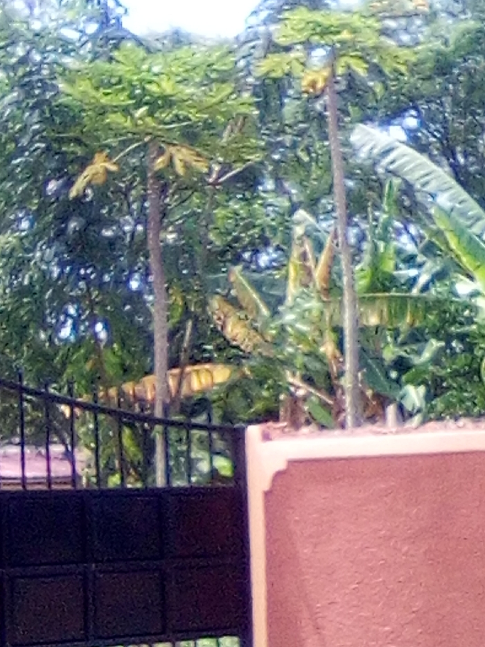 The scene depicts an outdoor environment in West Sakwa ward, Kenya, under natural daylight. In the foreground, a reddish-brown, textured pillar or wall section, bordered by a lighter trim with a decorative corner, is visible on the right. To its left, a section of a black metal gate or fence with vertical bars and rectangular segments is partially visible. The midground is characterized by dense tropical foliage, including at least two tall, slender papaya trees with green leaves and yellowish-green fruit near their crowns. Behind and interspersed with the papaya trees are broad green leaves indicative of banana plants, along with other thick green vegetation. A bright, possibly overcast sky is visible in the upper background through the tree canopy. No people, animals, or specific actions are present.