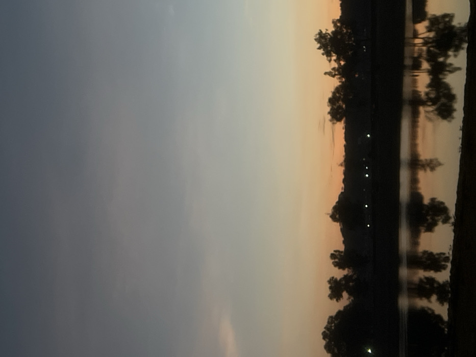 A tranquil lakeside scene at dusk, viewed sideways. The sky transitions from a deep gray to a warm orange-yellow near the horizon. Silhouetted trees line the water's edge, mirrored in the calm surface. Scattered lights dot the shoreline, reflected as shimmering points in the water. The dark land mass contrasts sharply with the colorful sky, creating a serene and peaceful atmosphere.