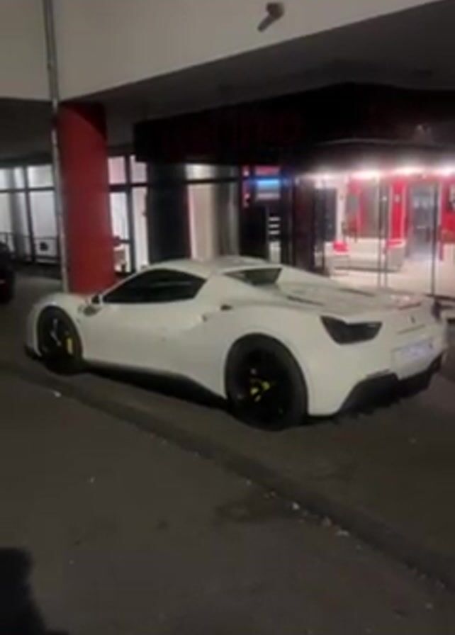 A white Ferrari is parked on the side of a street in front of a building with the word "Donterro" above the entrance. The car is facing left with its back end towards the viewer. It has black wheels and yellow brake calipers. The building is white with a red column to the left of the entrance. The entrance has glass doors and windows that are brightly lit. The street is dark, and the video appears to have been taken at night. There is another car parked further down the street to the left.