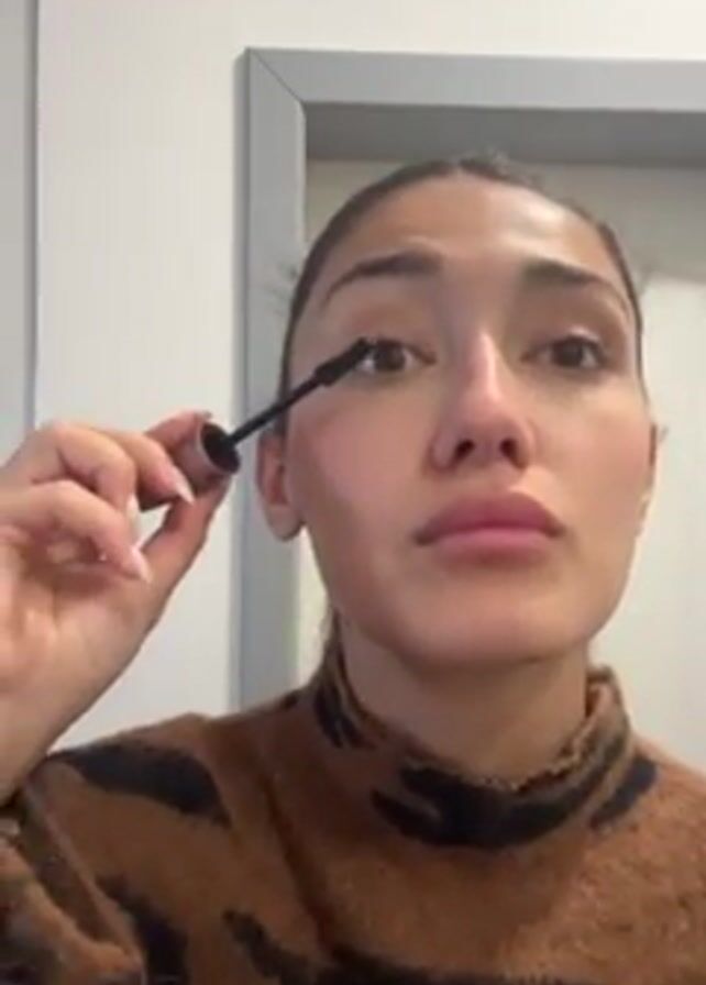 - "A woman with brown hair tied back and wearing a brown and black animal print turtleneck sweater is applying mascara to her upper eyelashes with her right hand" by FM-fSbZr2, licensed under CC BY 4.0