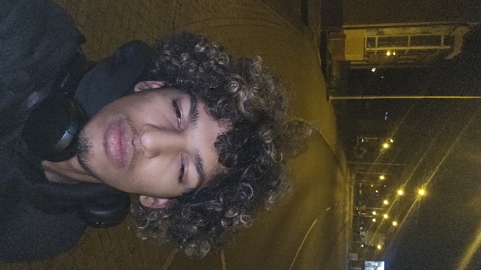A selfie-style shot rotated ninety degrees counter-clockwise shows a person with curly hair and headphones on their head