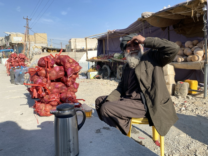 The image captures an outdoor market scene in Gundigan Village, Afghanistan, under clear blue skies with bright sunlight. In the mid-ground, an elderly man with a long, white beard and mustache, clad in a dark turban, a dark jacket, and dark trousers, is seated on a yellow plastic stool. He shields his eyes with his right hand, looking towards the right, and exhibits a faint smile. In the immediate foreground, a silver stainless steel thermos with a black handle and lid rests on a paved surface, casting a shadow. A small, clear glass containing a yellowish liquid is positioned to its right. To the left of the man, several tall stacks of red onions, contained within red mesh bags, are arranged on what appear to be handcarts or the ground, extending into the background along the paved area. Behind the man, a makeshift market stall features a brown fabric canopy and displays various produce, including a cluster of large, pale orange gourds or squashes on the right. A wooden cart with produce is partially visible under the canopy. Nearby, concrete blocks and a yellow jerrycan are situated. The background reveals simple, light-colored brick or mud-brick buildings lining a dusty, unpaved street, with utility poles and overhead wires visible. The strong sunlight creates distinct shadows across the scene.